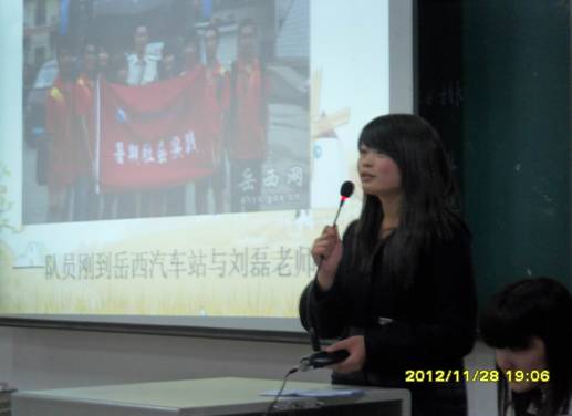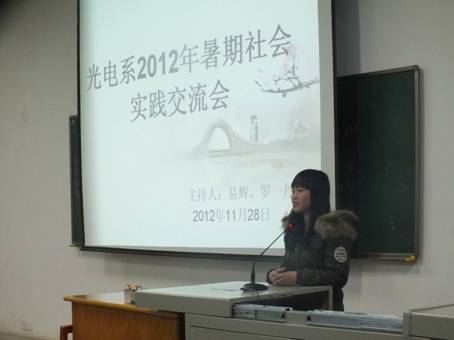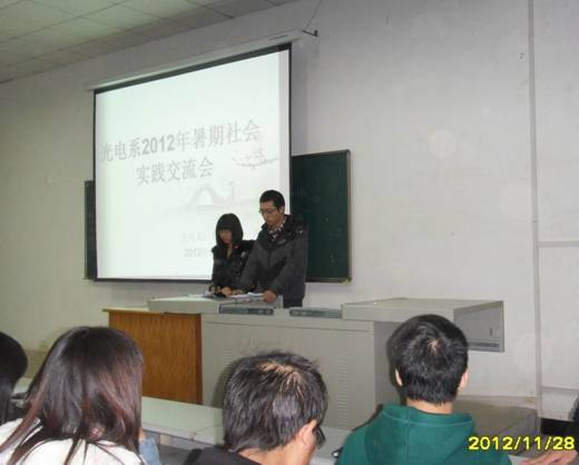 为了让全系学生深刻了解暑期社会实践的重要意义,同时总结经验、交流体会,使实践活动焕发出更强的生命力,广泛深入持久地开展下去,光电系于2012年11月28日在4213教室举行2012年暑期社会实践总结交流会。团总支书记吕璟、团队指导老师梁暗红及暑期社会实践团队成员和各班学生代表出席本次交流会。