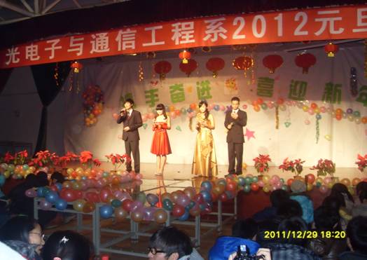 2011年12月30日晚六点,光电子与通信工程系全体师生于综合楼四楼多功能厅举办了“携手奋进喜迎新年”元旦晚会。光电系主任李建新、党总支副书记胡英、学生科负责人黄剑锋、团总支书记李凤及全体辅导员参加了本场演出。