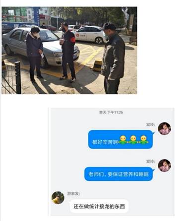 应用教研室游家发老师的爱人是医护人员,自疫情开始就一直奋战在一线,家里有上高中的儿子,接到任务后,他毫不犹豫参与到抗疫工作之中。社区每天都会分配新的工作任务,现在的主要工作是和中商超市进行对接,为居民提供送货服务。游老师所在的社区,受感染者较多,风险大任务重,他顶着巨大压力,积极服务社区,克服家庭困难,不让身为医生的爱人在一线有任何顾虑。