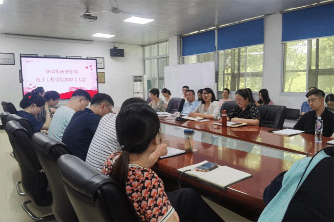 酷夏尽,时序已新秋。为总结经验,明确新学期各项工作职责与重点,找准新学期奋斗方向,扎实推进新学期各项教学工作平稳、有序、高效、务实地开展,2023年9月1日下午,电子工程学院召开全体教职工大会。会议由电子工程学院党总支书记李少勇主持,电子工程学院院长何琼、副书记王祎、副院长刘新灵、各教研室主任以及全体教职工参加会议。