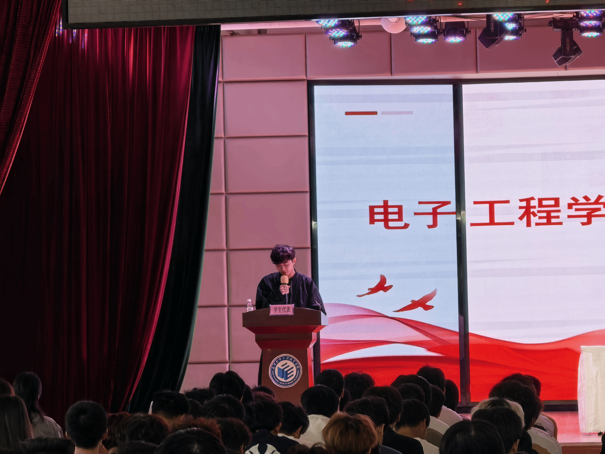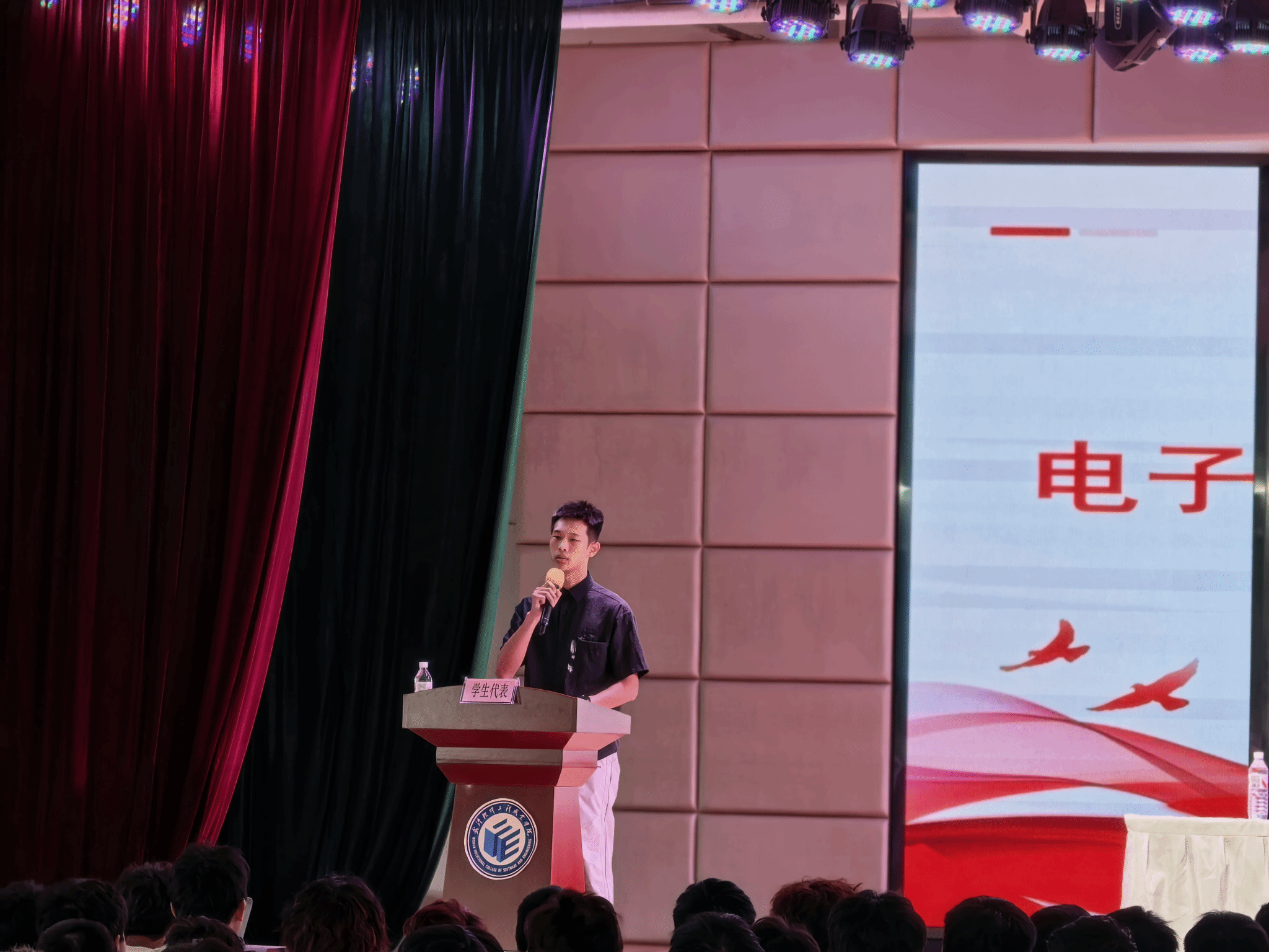 首先发言的是优秀毕业生代表、工业互联网技术专业2022级的杨卓。他以专业成绩排名第一和多项国家级、省级学科竞赛获奖殊荣,获评2023-2024学年国家奖学金。他结合自身在校学习、技能竞赛的成长经历,深情回顾了在电子工程学院度过的宝贵时光。他谈到,是学院扎实的课程体系、老师们的悉心指导以及浓厚的实践氛围,为他奠定了坚实的专业基础,锤炼了解决实际问题的能力。“珍惜课堂时光,主动走进实训室,积极参与项目与竞赛,勇于挑战自我”,是他送给学弟学妹们的肺腑之言。他的成长经历,如同一盏明灯,为新生们指明了努力的方向,增强了专业认同感与学习信心。