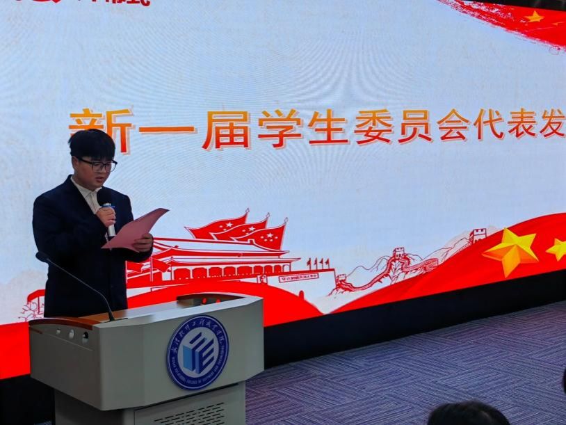 在新一届学生委员会成立仪式上,新当选委员代表郭秀宇作表态发言。他诚挚感谢了领导、老师与代表们的信任,并代表第六届学生委员会庄严承诺:“我们将争做思想引领的排头兵;搭建学院与学生的连心桥;打造高效协作的坚强集体;树立学生骨干的清新形象。”铿锵誓言在会场久久回荡,彰显出新一届委员会昂扬向上的精神风貌与砥砺奋进的坚定决心。
