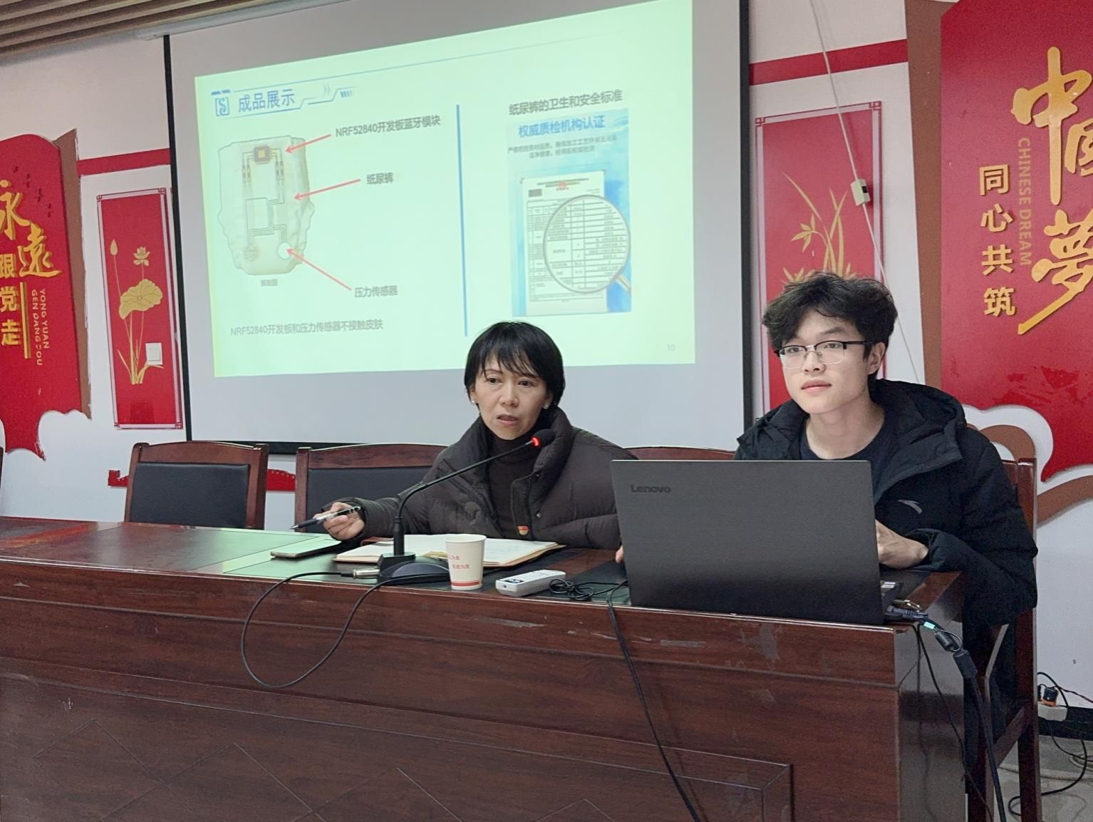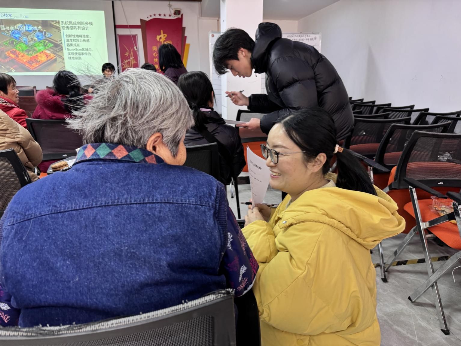 随后,活动进入核心交流环节。“挑战杯”团队用通俗易懂的语言介绍了《智能便溺柔芯守护》项目——通过轻便、无感的智能穿戴设备,在老人发生便溺时及时向照护者发出提醒,既减轻照护负担,也守护长者的体面与尊严。介绍刚结束,现场便响起热烈回应:“这个好啊!夜里起夜最怕着凉,价格贵不贵?”“等以后老伴我照顾不动了,真需要这样的帮手!”老人们纷纷结合自身或家人照护经历,畅谈夜间起夜不便、换洗辛苦、担心受凉等现实困扰,言语中既有殷切期待,也有难言辛酸。