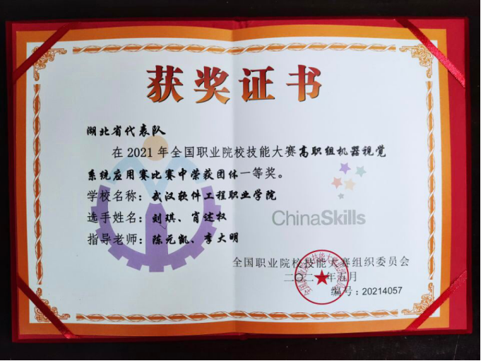 (通讯员:程潇潇)6月19日,2021年全国职业院校技能大赛(高职组)“机器视觉系统应用”赛项在武软举行。这是今年湖北省高职院校承办的唯一一场国赛。28支代表队参加此次比赛,经过一天8小时的激烈比拼,我院机电一体化技术专业学生刘琪、肖述权代表湖北省参赛,获得一等奖第一名,陈元凯、李大明老师获评“优秀指导教师”。