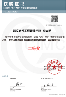 此外,在稍早结束的全国总决赛“自由探索赛项”中,电子工程学院陈元凯、李大明老师指导学生肖述权、刘琪、王馨怡获全国总决赛二等奖,值得注意的是“自由探索赛项”是中国智能制造挑战赛全部8个赛项中唯一一个不分本科组和高职组的赛项。