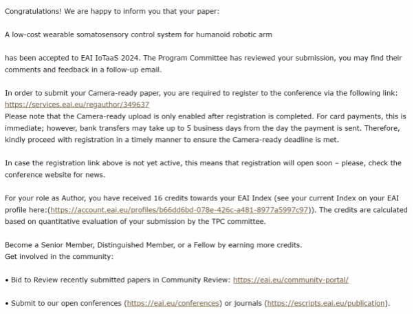 9月5日,我校电子工程学院工网2202班的赵定一收到了第十届物联网即服务(IoTAAS 2024)会议论文录用通知,该会议是由欧洲创新联盟(EAI) 发起并支持的国际性高水平学术会议,对全球征文,今年11月将在武汉举办。论文“A low-cost wearable somatosensory control system for humanoid robotic arm”能够被IoTAAS 2024录用,赵定一同学非常高兴。他说“这是我人生中第一篇国际会议论文,将被收入EI会议检索。感谢电子学院ROBOTAC团队,感谢指导教师邓峰、巨新浪的谆谆教诲!感谢学校的培养!”