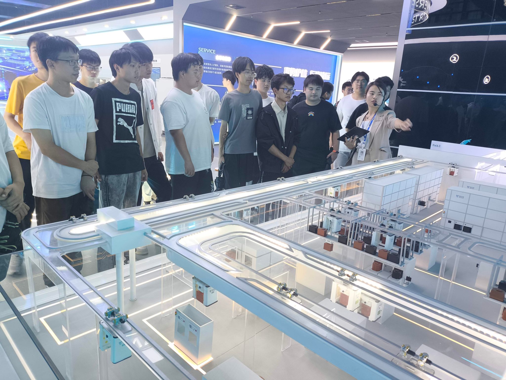 在企业工作人员的引导下,学生们参观了以“智能制造”为核心的展厅。展厅内,工业自动化、工业互联网平台、工业视觉、AIoT(人工智能物联网)解决方案、数字孪生技术等创新成果逐一呈现,生动展现了机电行业与数字化、智能化深度融合的实践案例。
