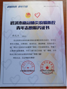 在武汉抗击新型冠状病毒的关键时期,他用实际行动诠释了青年学生的使命和担当,始终积极履行社会责任,战“疫”路上,感谢有你。