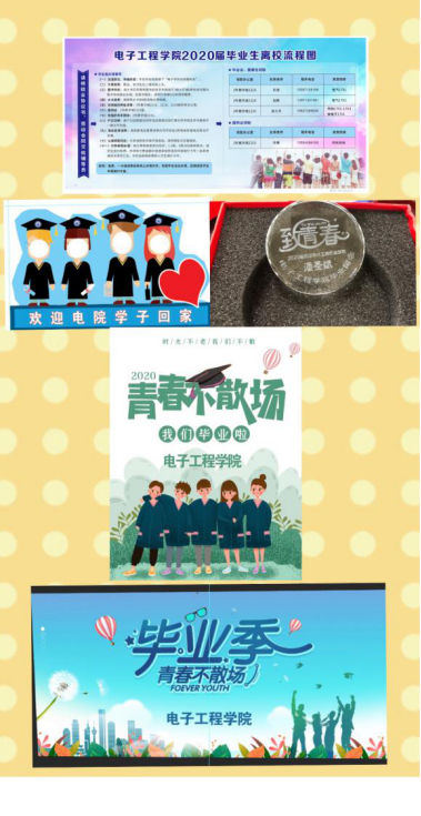 多少次的“云端”相见,终于等来了与电子工程学院2020届毕业生的相逢。6月初,电子工程学院全体老师都参与到毕业生返校准备工作中,整理好学生档案,分装好防护用品包,为每位毕业生提供贴心的文件袋,里面装有毕业证、团员档案、毕业生安全离校温馨提示等资料,此外还为每位同学专门制作富有专业特色的毕业纪念章。6月22日,学院召开毕业生返校离校工作会,建立了毕业生返校离校工作群,全院教职工积极主动参与到此次毕业生离校工作中,大家全力以赴做好服务,让毕业生们感受到电子工程学院这个大家庭的温暖。
