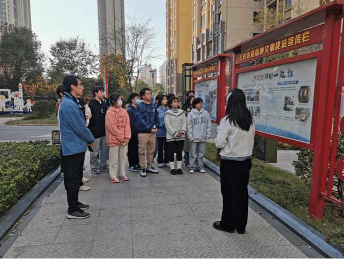 接着我院师生在社区主干道上一排排左岭街道精神文明建设宣传栏驻足观看,社区讲解员带领大家重温了习近平总书记2022年6月考察智苑社区时的殷殷嘱托,详细介绍了社区 “2018至2019年一起建”、“2020年一起扛”、“2021年一起防”、“2022年一起奔”的建设历程,以及“美好环境与幸福生活共同缔造”工作开展经验,清楚展示了2018年至2023年以来党建引领社区基层治理的各项成就。看到那一项项成就,同学们深刻感受到了中国共产党全面落实以人民为中心、扎实推进共同富裕的发展思想,以及“全心全意为人民服务”的根本宗旨。