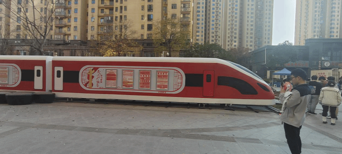 初入社区,迎目而来的是一辆红色高铁模型,上面书写着醒目而刚劲有力的党的二十大报告,充满浓厚的党建工作氛围。随后社区讲解员在简要介绍完智苑社区的基本情况后,便带领着我院师生参观社区建设品牌项目“共享客厅·红色驿站”。共享客厅原为单元的入户大厅,根据实际需求,分别被改造为清廉文化、安全教育、志愿服务等不同主题的公共空间, 旨在以共同文化凝聚人心,以实际需要整合资源,切实丰富了社区服务方式,实现精准对接、高效服务。